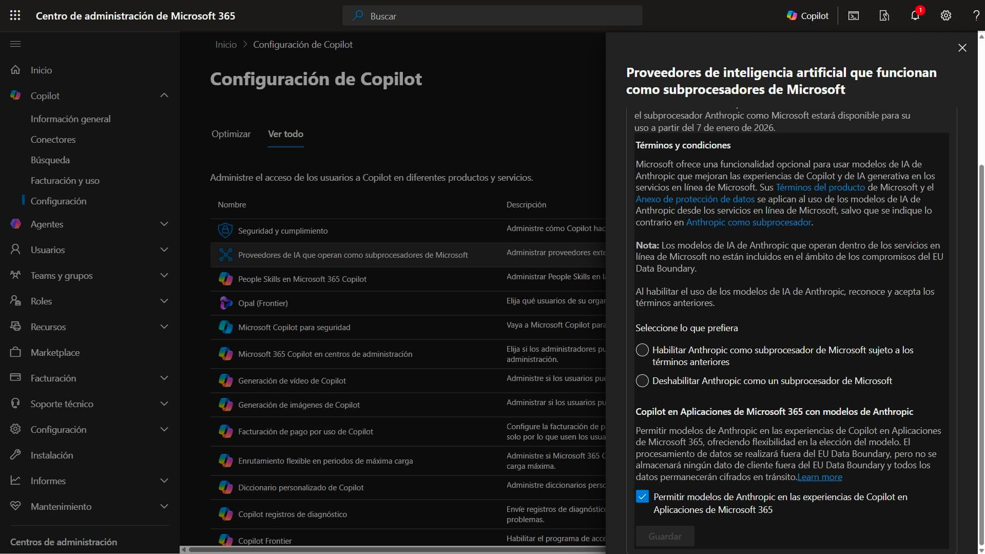 Por este motivo, resulta recomendable revisar la configuración asociada al uso de modelos externos como los de Anthropic dentro de Microsoft 365 Copilot. Esta opción puede gestionarse desde el centro de administración de Microsoft, accediendo a https://admin.microsoft.com y navegando a «Copilot» -> «Configuración» -> «Ver todo».